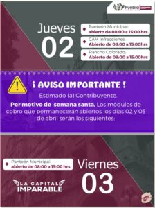 Este 02 de abril de 2026, el horario de atención será de 8:00 a 15:00 horas en las cajas de cobro ubicadas en el Panteón Municipal, instalaciones del CAM infracciones y Rancho Colorado.