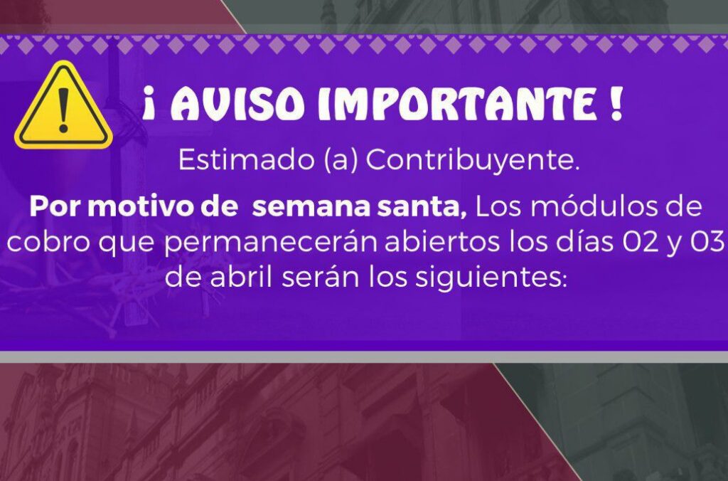 Puebla, Pue., 01 de abril de 2026.- Con motivo del periodo vacacional de Semana Santa, el Gobierno de la Ciudad, que encabeza el alcalde Pepe Chedraui, informa a las y los contribuyentes los horarios de atención de los módulos de cobro para diversos servicios.