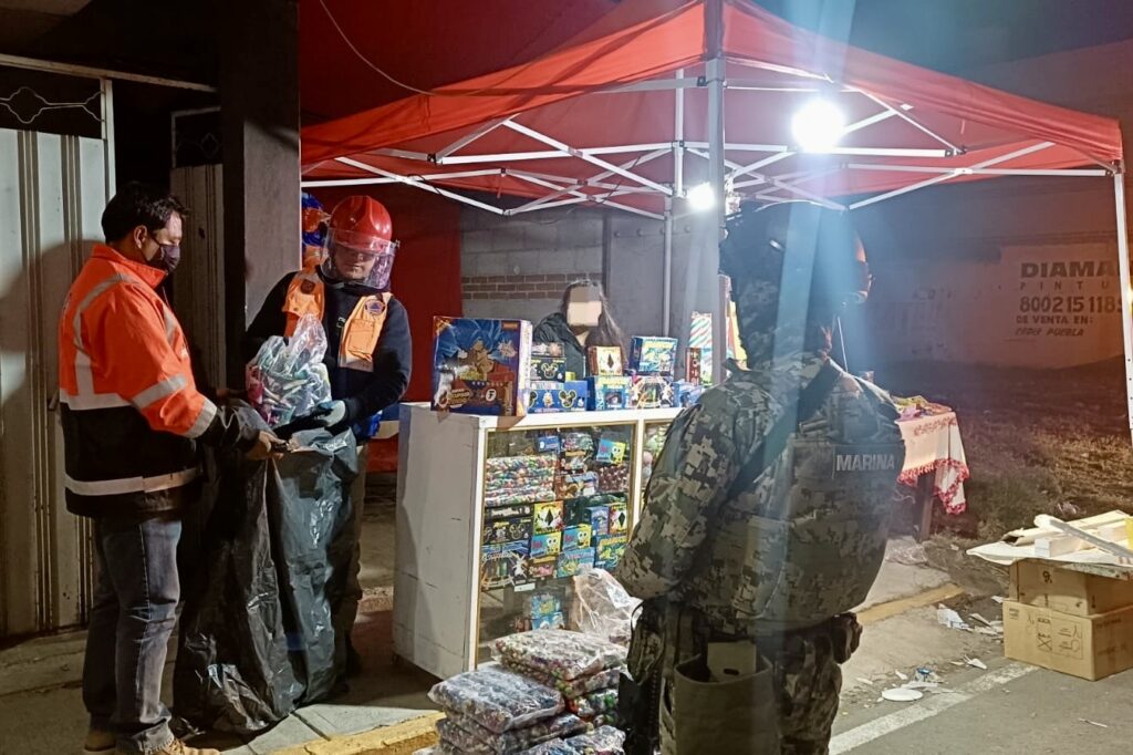 Huejotzingo, Pue.- En el marco del operativo “Navidad Segura”, personal de Protección Civil de Huejotzingo, en coordinación con elementos de la Secretaría de Marina (Semar), llevó a cabo un operativo de inspección en la Cabecera Municipal y Juntas Auxiliares, logrando el decomiso de 100 kilogramos de pirotecnia de detonación.