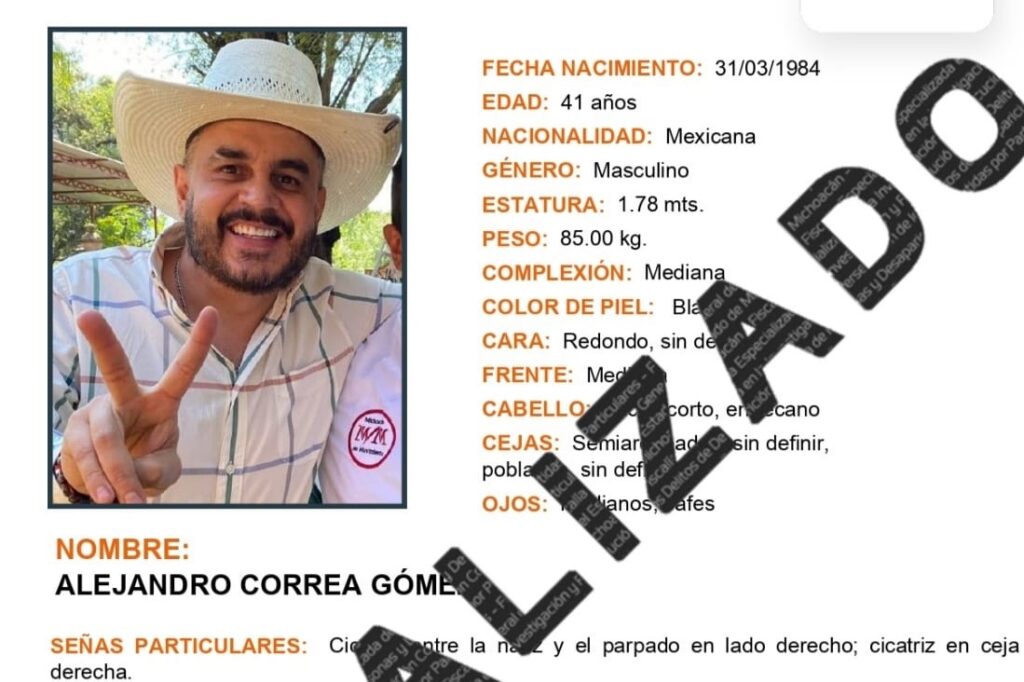 El exalcalde de Zinapécuaro, Michoacán, Alejandro Correa Gómez, fue localizado con vida este jueves, cinco días después de haber sido reportado como desaparecido.