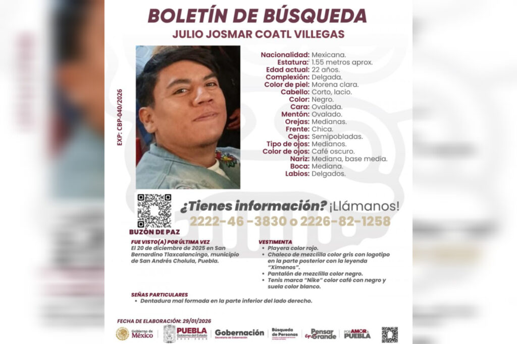 Julio Josmar desapareció en la junta auxiliar de San Bernardino Tlaxcalancingo, perteneciente a San Andrés Cholula. Desde aquel 20 de diciembre, sus padres y amigos emprendieron una campaña incansable en redes sociales y calles de la zona metropolitana, exigiendo a la Fiscalía General del Estado (FGE) agilizar las investigaciones.