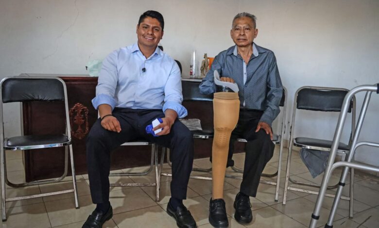 CUAUTLANCINGO, PUE. Cumpliendo la promesa hecha en campaña de donar mensualmente la mitad de su salario para causas sociales, Omar Muñoz, presidente municipal de Cuautlancingo, entregó una prótesis de pierna a un adulto mayor.