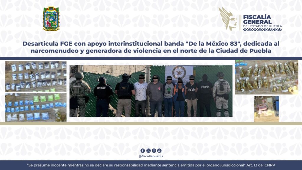 Como parte de la estrategia para combatir actividades ilícitas relacionadas con la venta y distribución de droga, la Fiscalía General del Estado (FGE) llevó a cabo un operativo coordinado con la Secretaría de la Defensa Nacional (DEFENSA), la Secretaría de Marina (SEMAR), la Guardia Nacional (GN) y la Secretaría de Seguridad Pública Estatal (SSPE), mediante el cual se logró desarticular una célula delictiva identificada como generadora de violencia en el norte de la ciudad de Puebla.