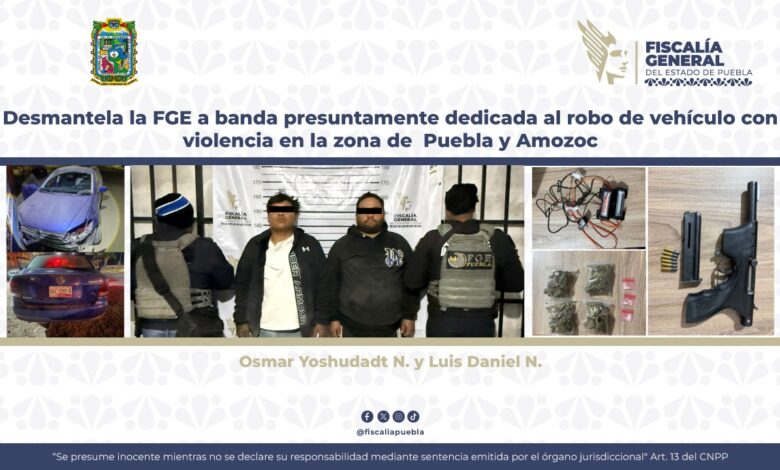 La Fiscalía General del Estado desarticuló mediante un operativo a banda delictiva presuntamente dedicada al robo de vehículo con violencia en la zona limítrofe de los municipios de Puebla y Amozoc, operación en la que fueron asegurados Osmar Yoshudadt N. y Luis Daniel N. como probables integrantes.