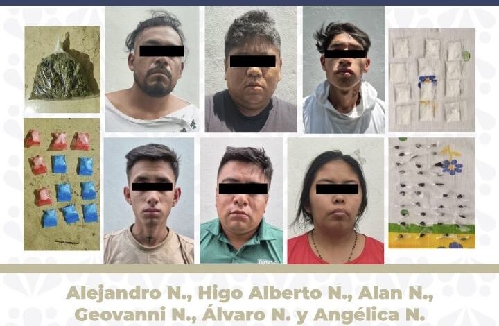 Durante la intervención fueron detenidas seis personas identificadas como Alejandro N., Higo Alberto N., Alan N., Geovanni N., Álvaro N. y Angélica N., quienes presuntamente integraban esta célula delictiva. En el inmueble se aseguraron 56 dosis de crack, 12 dosis de cocaína, 30 dosis de cristal, 35 dosis de heroína, una bolsa con hierba verde con características similares a la marihuana, así como dos básculas grameras.