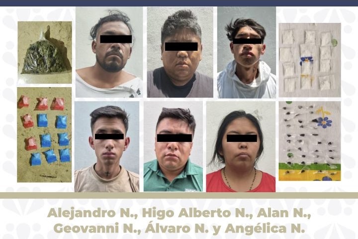 Durante la intervención fueron detenidas seis personas identificadas como Alejandro N., Higo Alberto N., Alan N., Geovanni N., Álvaro N. y Angélica N., quienes presuntamente integraban esta célula delictiva. En el inmueble se aseguraron 56 dosis de crack, 12 dosis de cocaína, 30 dosis de cristal, 35 dosis de heroína, una bolsa con hierba verde con características similares a la marihuana, así como dos básculas grameras.