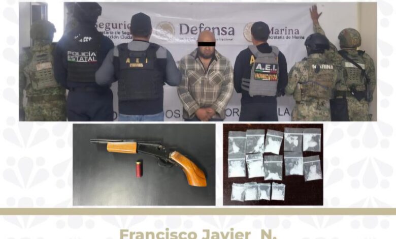 Al marcarle el alto, el sujeto presuntamente realizó disparos de arma de fuego en contra de los agentes, por lo que, en coordinación con la Secretaría de la Defensa Nacional (DEFENSA), la Secretaría de Marina (SEMAR) y la Secretaría de Seguridad Pública Estatal (SSPE), se logró su detención. Asimismo, entre sus pertenencias fueron localizados un arma de fuego y diversos envoltorios con la droga conocida como cristal.
