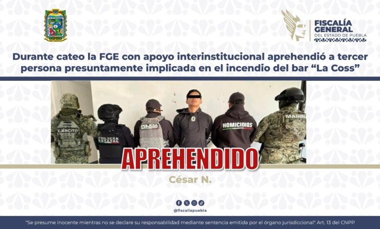 Derivado de una intensa labor de inteligencia y coordinación interinstitucional, la Fiscalía General del Estado de Puebla, con apoyo de la Secretaría de Marina (SEMAR), la Secretaría de la Defensa (DEFENSA), la Guardia Nacional (GN) y la Secretaría de Seguridad Pública Estatal (SSPE), desahogo un cateo que permitió la detención de César N., de 19 años de edad, quien contaba con orden de aprehensión por su presunta participación en el incendio del bar “La Coss”.