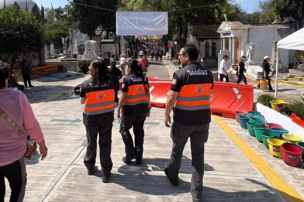Se verificó la aplicación de las medidas preventivas en materia de protección civil, constatando una afluencia continua y fluida de visitantes. Asimismo, se llevó a cabo la inspección de tumbas y capillas previamente encintadas, verificando su delimitación y condiciones estructurales. Como parte de las acciones de mitigación, se reubicaron escombros que obstruían pasillos y, en coordinación con la administración de los panteones, se procedió al relleno de fosas en proceso de excavación para prevenir accidentes, a través del personal de la Dirección de Gestión de Riesgos en materia de Protección Civil de la Secretaría de Gestión y Desarrollo Urbano.
