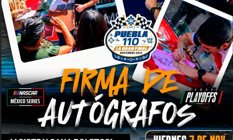 Puebla, Pue., 04 de noviembre de 2025.- Para promover la convivencia familiar y eventos de primer nivel entre las y los poblanos, el Gobierno de la Ciudad que encabeza el alcalde Pepe Chedraui Budib, invita a la firma de autógrafos de una veintena de pilotos y exhibición de autos de NASCAR México Series, el próximo viernes 7 de noviembre, a las 17:00 horas, en el estacionamiento del Parque Juárez.