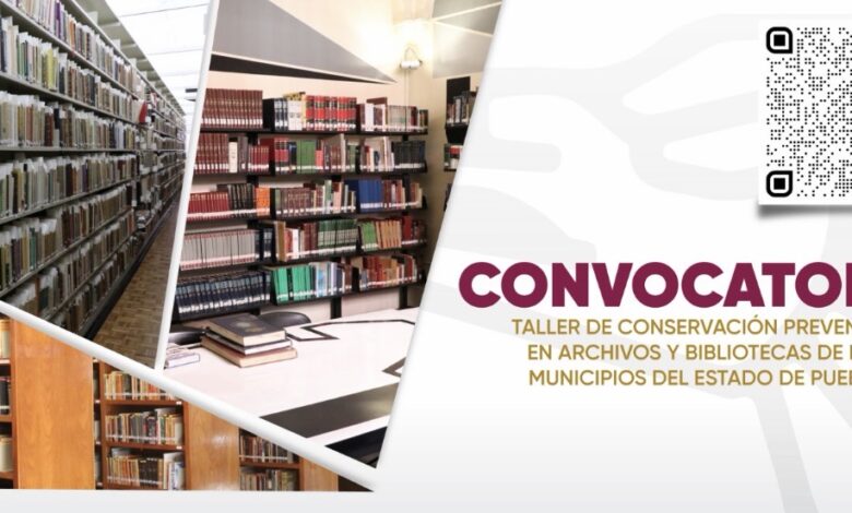 La Secretaría de Arte y Cultura anuncia la convocatoria al “Taller de Conservación Preventiva en Archivos y Bibliotecas de los Municipios del Estado de Puebla”, como parte de la estrategia institucional para fortalecer la preservación y protección del patrimonio documental que da identidad y memoria.