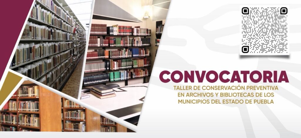 La Secretaría de Arte y Cultura anuncia la convocatoria al “Taller de Conservación Preventiva en Archivos y Bibliotecas de los Municipios del Estado de Puebla”, como parte de la estrategia institucional para fortalecer la preservación y protección del patrimonio documental que da identidad y memoria.