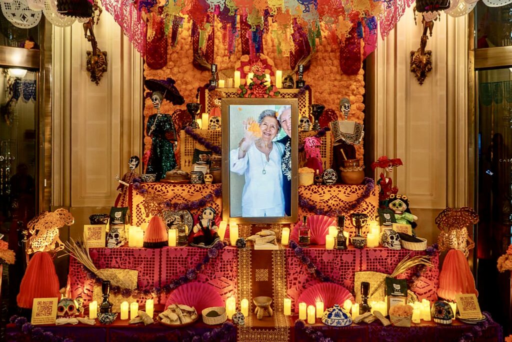 Con una altura de tres metros, la instalación fusiona la estética tradicional mexicana con elementos contemporáneos. Se compone de cuatro niveles adornados con flores de cempasúchil, papel picado, talavera poblana, textiles bordados y objetos personales que evocan la vida cotidiana de las abuelas, rebozos, recetarios, juguetes, fotografías rodeados de luz y color.