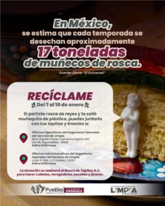 Puebla, Pue., 08 de enero de 2026.- Con el fin de contribuir al cuidado del medio ambiente, el Gobierno de la Ciudad, que encabeza el alcalde, Pepe Chedraui, a través del Organismo Operador del Servicio de Limpia (OOSL) puso en marcha una campaña especial de recolección de muñecos de Rosca para evitar sean desechados y terminen en la basura, transformando esta tradición en un acto solidario y responsable.