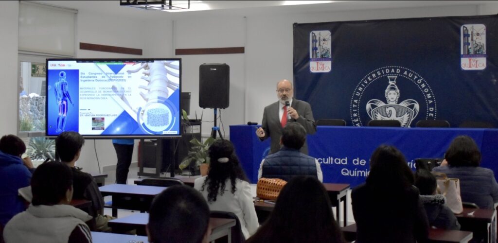 Ante alumnos de la FIQ, el investigador relató la evolución e importancia de los biomateriales, de la Segunda Guerra Mundial a la época actual. También dio a conocer su trabajo desarrollado en 15 años, cuyo objetivo es buscar la adhesión o biocompatibilidad del citado material en los sistemas que serán utilizados como andamios. Por otra parte, Rodríguez Lugo indicó que igualmente se indaga en la búsqueda de sistemas transportadores de fármacos y de mecanismos que contrarresten los efectos de distintos tipos de cáncer.