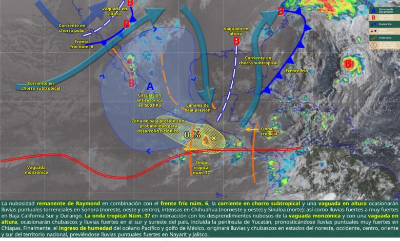 Este día, la nubosidad remanente de Raymond en combinación con el frente frío núm. 6, la corriente en chorro subtropical, una vaguada en altura e inestabilidad atmosférica sobre el noroeste del territorio nacional, ocasionarán lluvias puntuales torrenciales en Sonora (noreste, oeste y centro), intensas en Chihuahua (noroeste y oeste) y Sinaloa (norte); así como lluvias fuertes a muy fuertes en Baja California Sur y Durango.