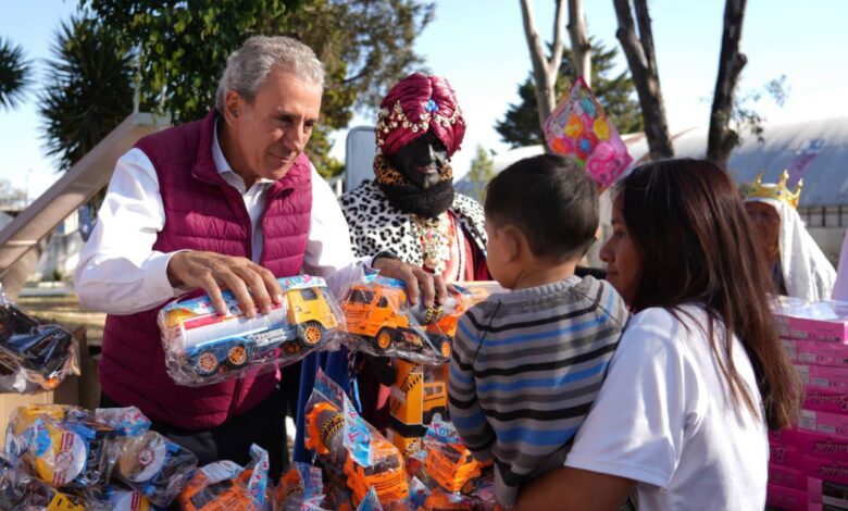 Puebla, Pue.- Los Reyes Magos llegaron a través del DIF Puebla Capital del Gobierno de la Ciudad, a la Junta Auxiliar Ignacio Romero Vargas, y a la colonia La Rosa. El alcalde Pepe Chedraui encabezó la entrega a los cientos de niñas y niños que llegaron para recibir sus presentes.