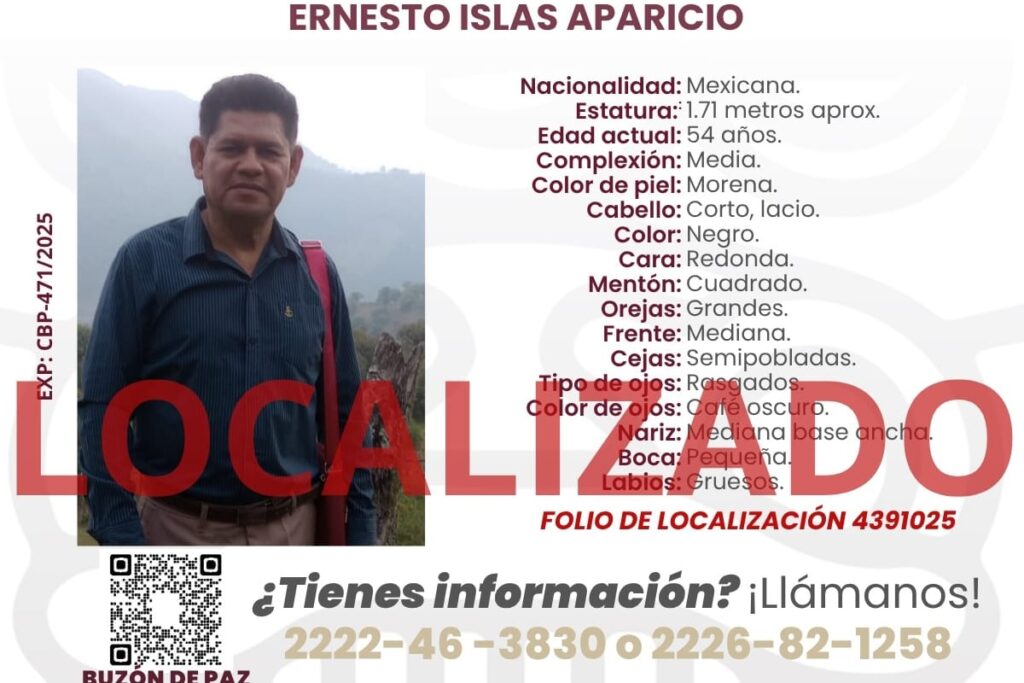 La Comisión de Búsqueda de Personas del Estado de Puebla, encabezada por Juan Enrique Rivera Reyes, confirmó la localización a través de sus redes sociales oficiales.