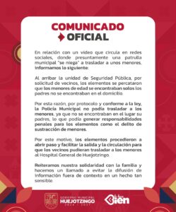 Incluso, se difundió en redes sociales el video de una de elementos de la Policía Municipal de Huejotzingo, que según los usuarios, se negaron a trasladar a los menores, situación de la que el Ayuntamiento se deslindó, ya que los padres no se encontraban en el lugar y los elementos podían incurrir en responsabilidades de tipo penal.