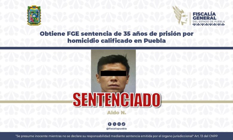 La Fiscalía General del Estado de Puebla (FGE) obtuvo sentencia condenatoria de 35 años de prisión contra Aldo N., de 33 años, responsable del delito de homicidio calificado, por hechos ocurridos en la colonia Miguel Hidalgo, en la ciudad de Puebla.