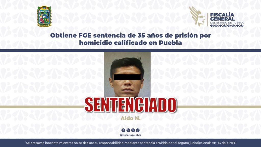 La Fiscalía General del Estado de Puebla (FGE) obtuvo sentencia condenatoria de 35 años de prisión contra Aldo N., de 33 años, responsable del delito de homicidio calificado, por hechos ocurridos en la colonia Miguel Hidalgo, en la ciudad de Puebla.