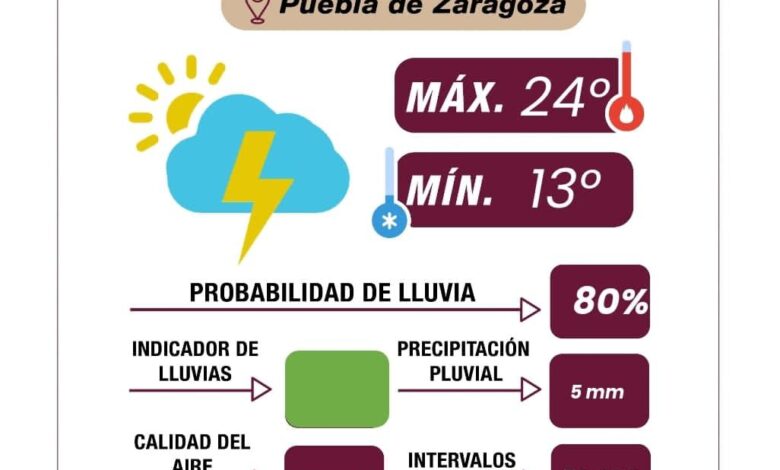 Puebla, Pue., 02 de octubre de 2025.- El Gobierno de la Ciudad informa que se espera un día parcialmente nublado con alta probabilidad de lluvias acompañadas de tormentas eléctricas durante la tarde. Se prevé una acumulación de lluvia entre 0 y 5 mm aproximadamente a las 16:00 horas. Las temperaturas oscilarán entre una mínima de 13°C y una máxima de 24°C. El índice UV será extremo, por lo que se recomienda evitar la exposición prolongada al sol y usar protector solar. La calidad del aire se mantiene en niveles buenos.