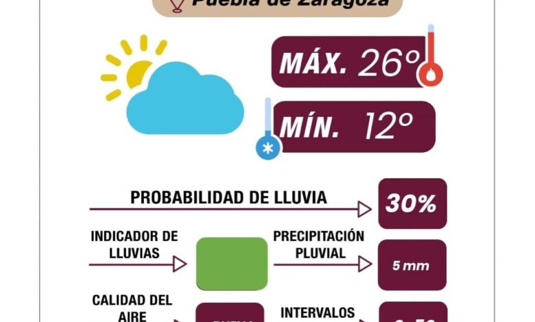 Puebla, Pue., a 13 de octubre de 2025.- El Gobierno de la Ciudad informa que se presenta este día con condiciones de cielo parcialmente nublado y baja probabilidad de lluvia, con una acumulación estimada entre 0 y 5 mm. Se espera una temperatura máxima de 26°C y una mínima de 12°C. Es importante destacar que el índice UV se encuentra en niveles extremos, por lo que se recomienda tomar medidas de protección. La calidad del aire se mantiene en niveles buenos.