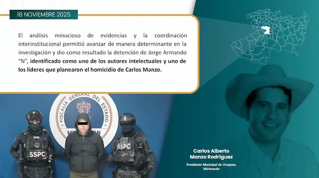 Redacción.— El asesinato de Carlos Alberto Manzo Rodríguez, presidente municipal de Uruapan, fue resultado de una operación criminal planificada y ejecutada con seguimiento en tiempo real, coordinación por mensajes cifrados y órdenes directas para ultimarlo sin importar su compañía. Así lo informaron el secretario de Seguridad federal, Omar García Harfuch, y el fiscal de Michoacán, Carlos Torres Piña, al confirmar la captura de Jorge Armando “N”, alias El Licenciado, señalado como autor intelectual.