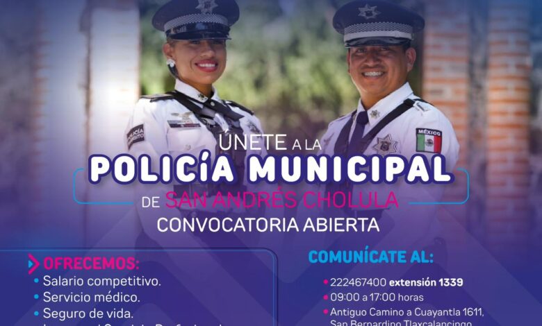 San Andrés Cholula, Puebla.– La Secretaría de Seguridad Pública y Protección Ciudadana (SSPPC) de San Andrés Cholula mantiene abierta la convocatoria para la incorporación de nuevos elementos a la Policía Municipal, con el propósito de fortalecer las tareas de vigilancia, prevención del delito y proximidad social en el municipio.