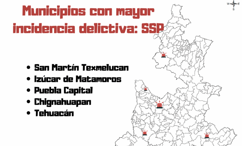 San Martín Texmelucan, Izúcar de Matamoros, Puebla capital, Chignahuapan y Tehuacán son los municipios que han registrado la mayor incidencia delictiva durante la actual administración, informó el titular de la Secretaría de Seguridad Pública (SSP), Francisco Sánchez González.