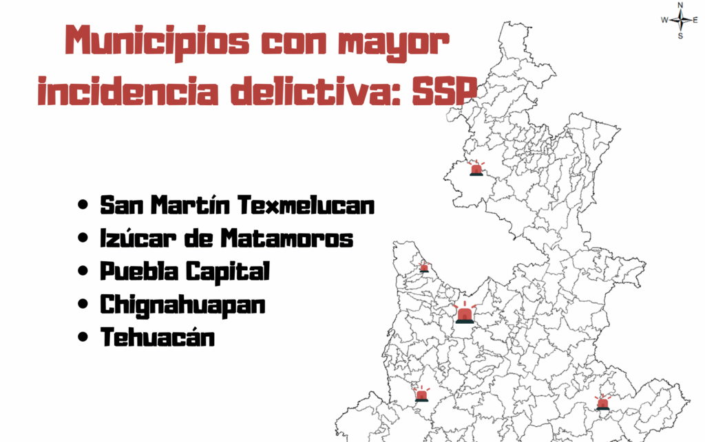 San Martín Texmelucan, Izúcar de Matamoros, Puebla capital, Chignahuapan y Tehuacán son los municipios que han registrado la mayor incidencia delictiva durante la actual administración, informó el titular de la Secretaría de Seguridad Pública (SSP), Francisco Sánchez González.