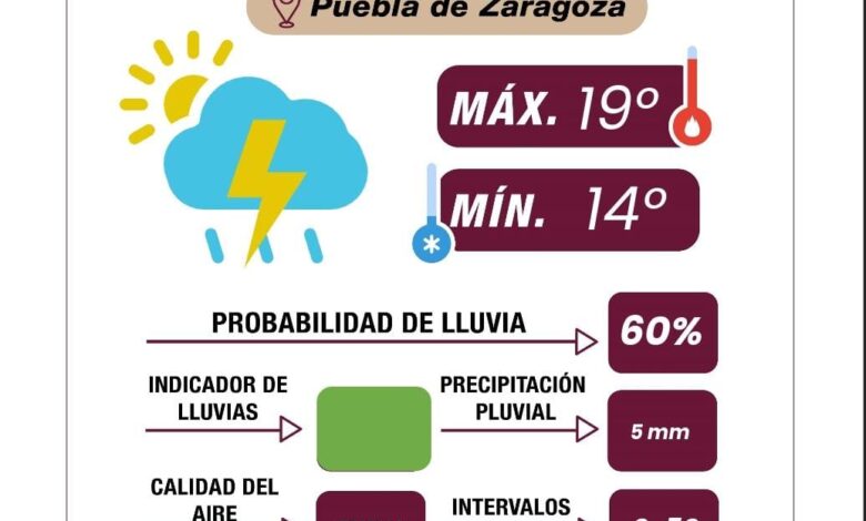 Puebla, Pue., a 09 de octubre de 2025.- El Gobierno de la Ciudad, a través del Comité de Fenómenos Hidrometeorológicos “Tlaloc” y con base en información emitida por la Comisión Nacional del Agua (CONAGUA) y el Servicio Meteorológico Nacional (SMN), informa que para este día se pronostican condiciones meteorológicas inestables en la capital. Se espera cielo mayormente nublado durante gran parte del día, con lluvias ligeras por la mañana (de 0.5 a 3 mm) y tormentas dispersas por la tarde entre las 17:00 y 19:00 horas, con una precipitación estimada de 6 a 12 mm.