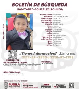 – Liam Tadeo González Lechuga, de 6 años, desaparecido el 9 de octubre en Piedras Pintadas, Huauchinango. El menor habría sido arrastrado por un deslave junto con su abuela, cuyo cuerpo ya fue localizado.