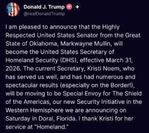 Trump anuncia salida de Kristi Noem y propone a Markwayne Mullin para Seguridad Nacional