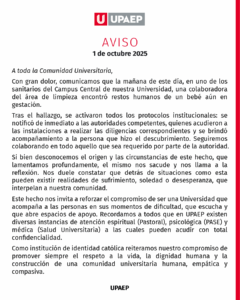 “Este hecho nos invita a reforzar el compromiso de ser una Universidad que acompaña a las personas en sus momentos de dificultad, que escucha y que abre espacios de apoyo. Recordamos a todos que en UPAEP existen diversas instancias de atención espiritual (Pastoral), psicológica (PASE) y médica (Salud Universitaria) a las cuales pueden acudir con total confidencialidad”.