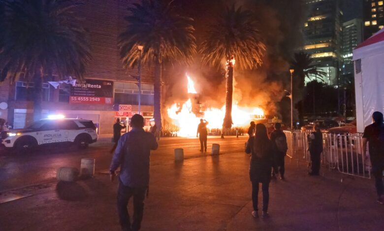 Momento exacto del incendio de un restaurante frente al Monumento a la Revolución en CDMX.