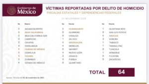 Según el informe, el 1 de noviembre se reportaron tres asesinatos, mientras que el 2 y 3 de noviembre se registraron seis casos por día, lo que refleja un incremento de la violencia en el estado.