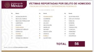 Según el informe, el 1 de noviembre se reportaron tres asesinatos, mientras que el 2 y 3 de noviembre se registraron seis casos por día, lo que refleja un incremento de la violencia en el estado.
